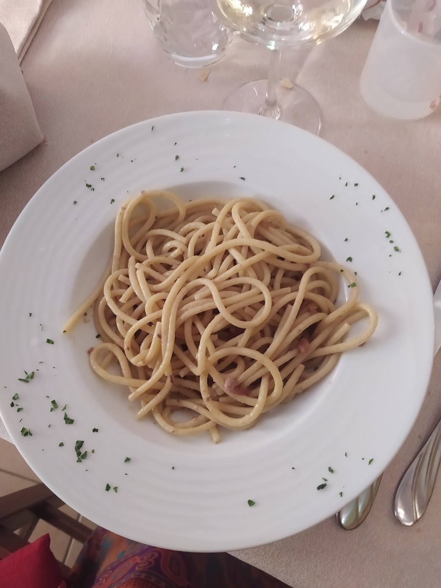 We called in to La Taverna del Lago for dinner after reading good reviews. The waitress was really friendly and helpful. I ordered spaghetti with clams and the wife ordered sliced beef with potatoes. The food arrived quite quickly and we washed it down with a bottle of local red wine. Both were very nice and we will certainly come back again, thank you